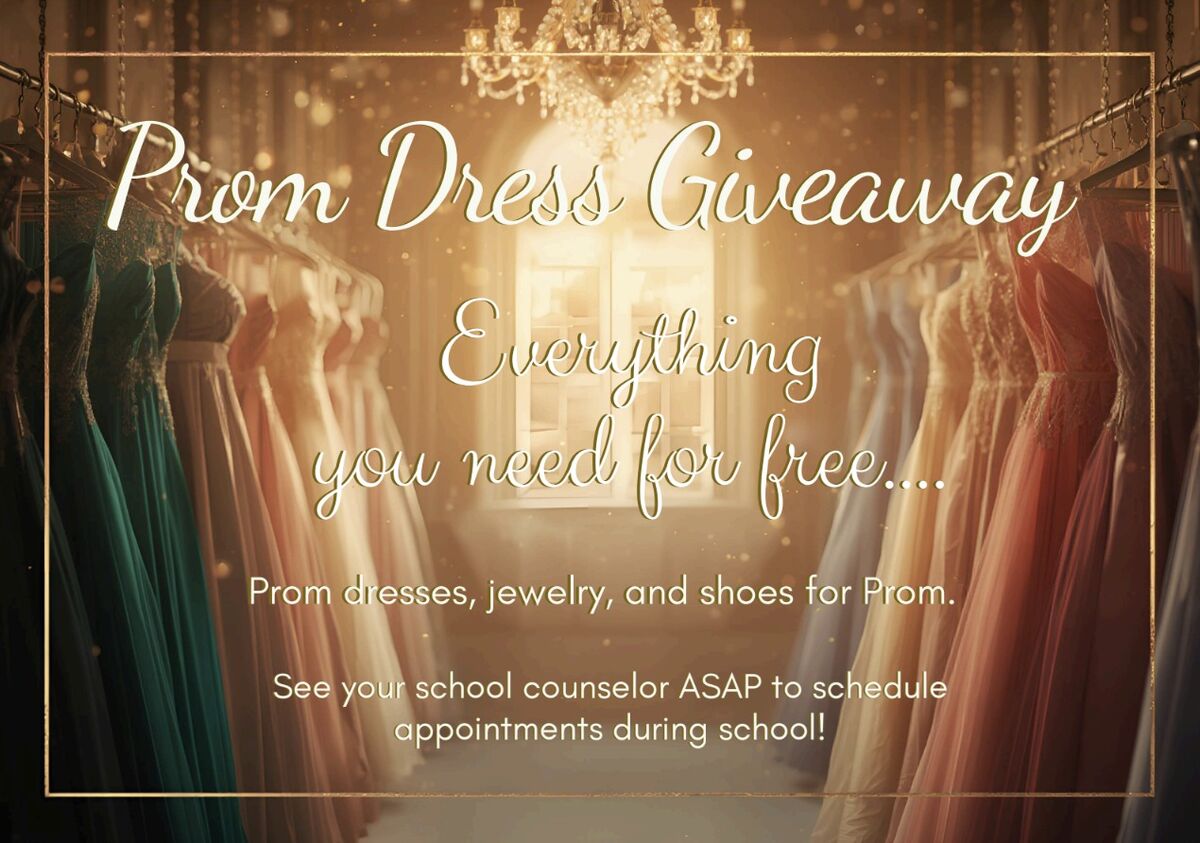 March 19, 2026 Prom Dress Giveaway! Prom Dress Giveaway! Get everything you need for prom—dresses, jewelry, and shoes… all for FREE! Be sure to see your school counselor ASAP to schedule your appointment during school hours!